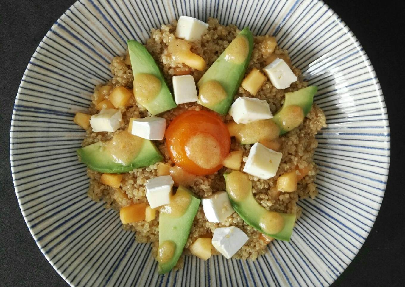 Ensalada de quinoa, caqui, aguacate y queso brie