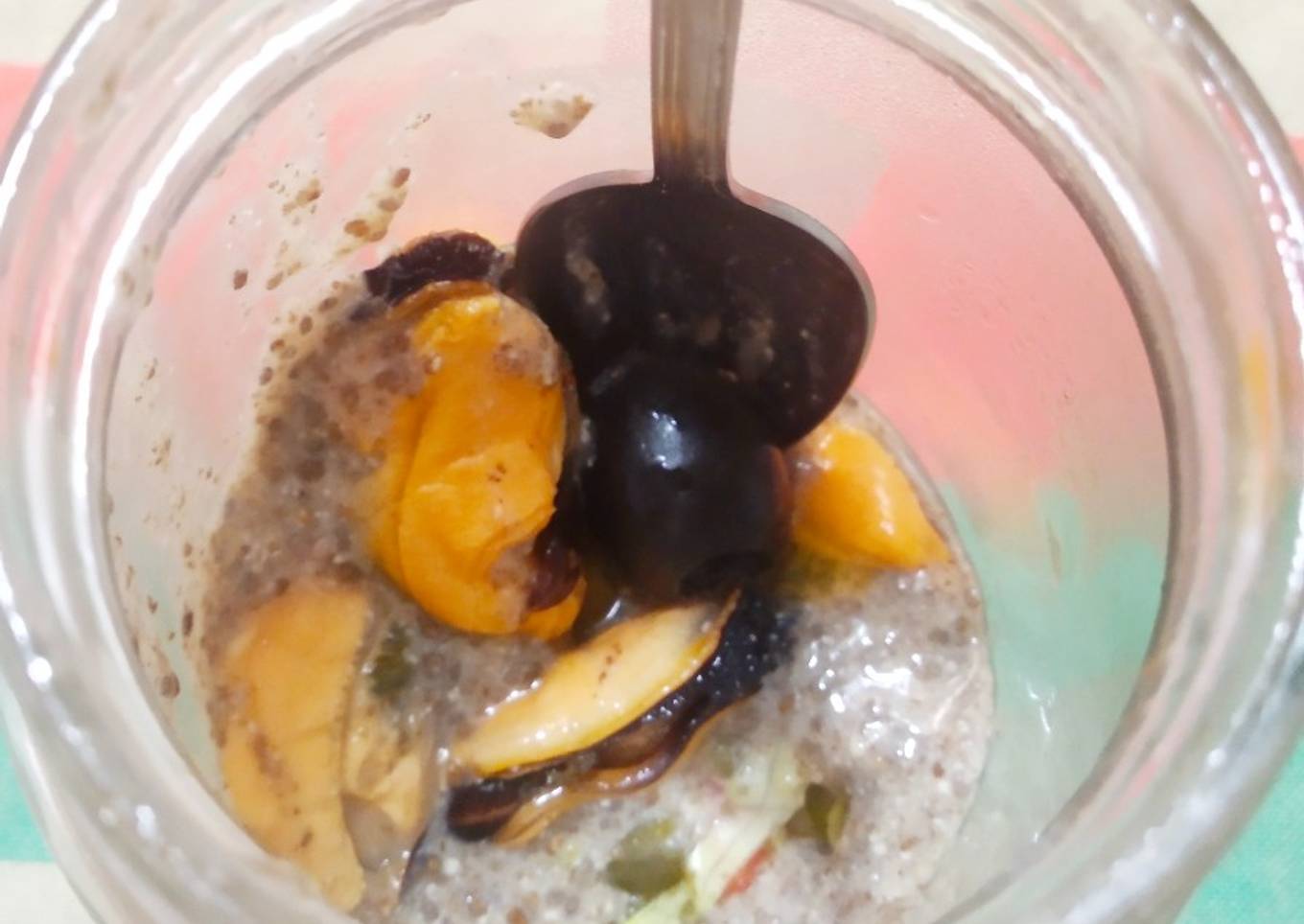 - En un bote echar el caldo de los mejillones, el zumo de limón, la cerveza y la chía. Batir con la batidora. Esperar 1 minuto y volver a batir. Dejar reposar 15 minutos y reservar
