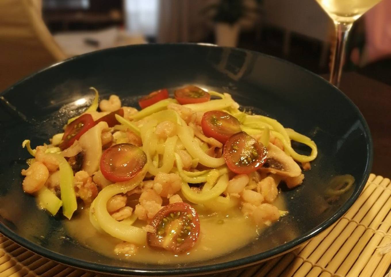 Espagueti de calabacín con champiñones y gambas