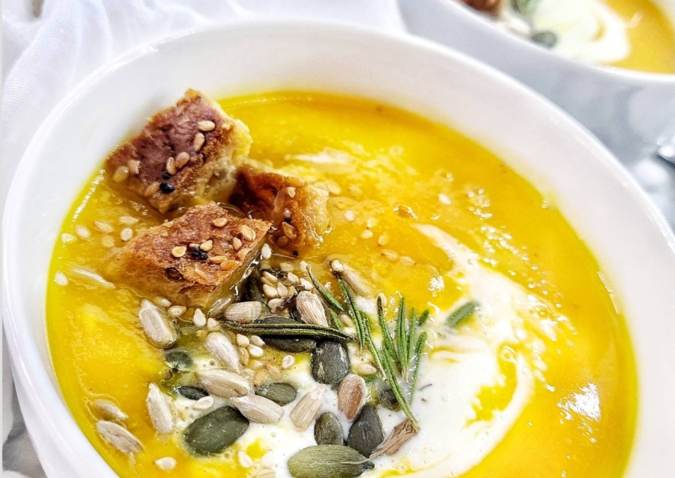 - Sirve y decora con algunas de las semillas, un chorrito de nata ligera y cuadritos de pancito tostado