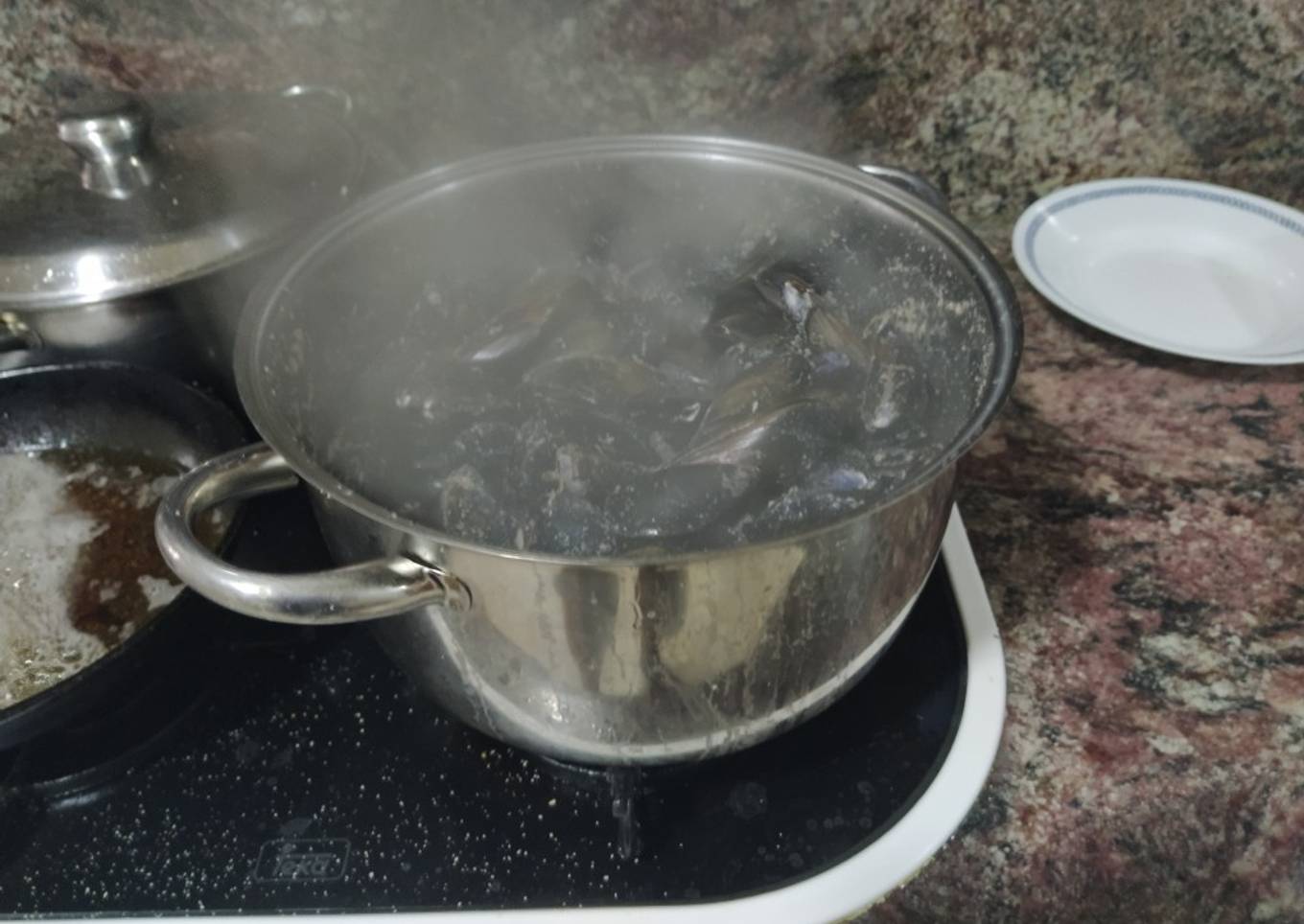 - Cogemos una cazuela y ponemos todos los mejillones.