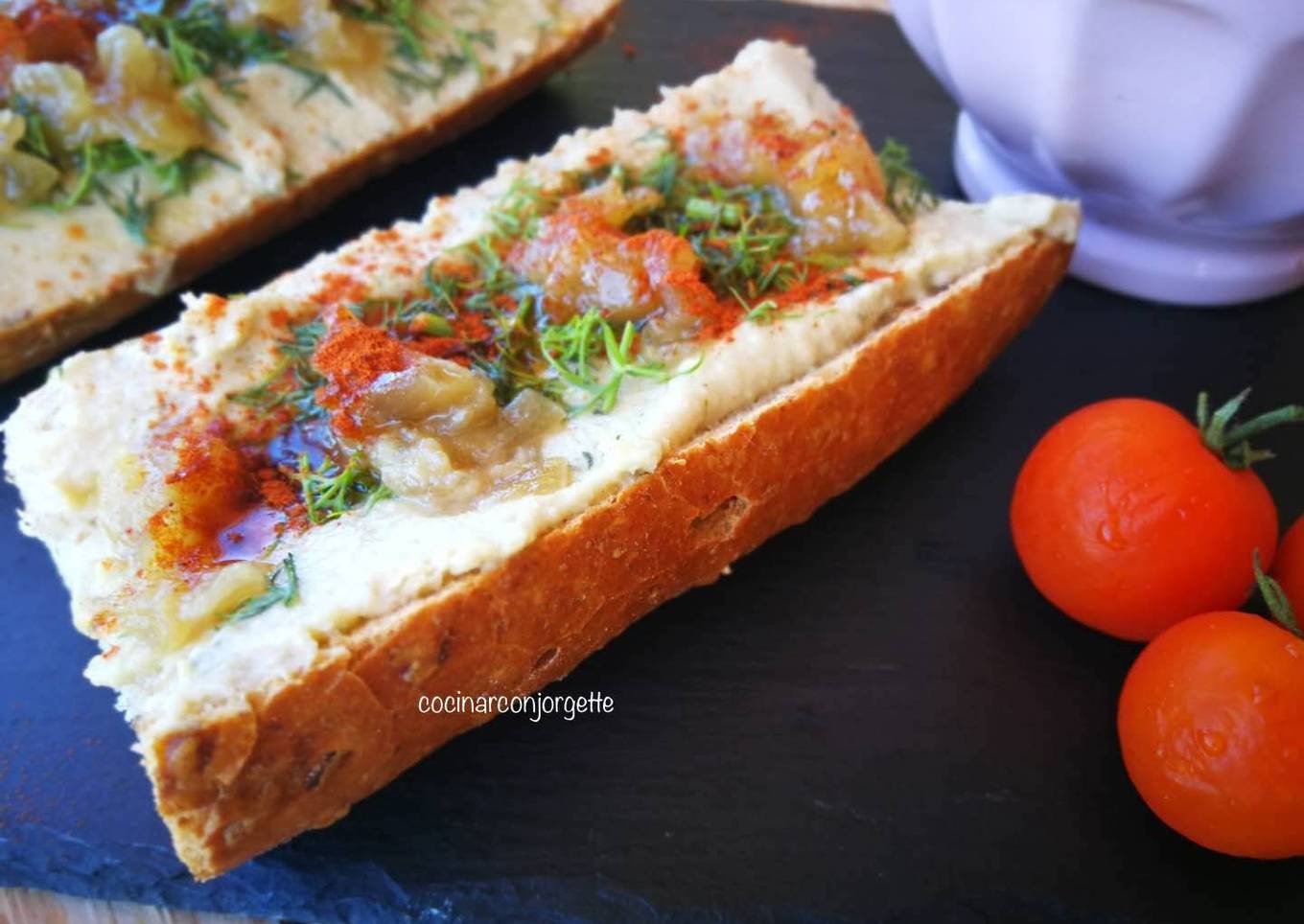 - Cortar el pan en trozos para bocadillo y cada trozo por la mitad. Untar generosamente con hummus. Decorar cada la mitad con eneldo picado y cebolla caramelizada. Espolvorear una pizca de pimentón dulce o picante ahumado de La Vera y buen provecho!!!!