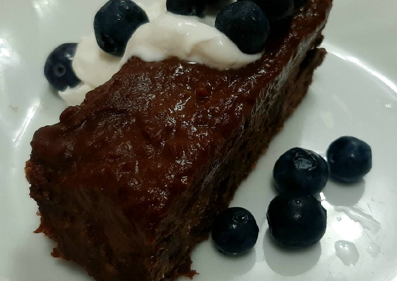 - Cuando el brownie se haya enfriado pon sobre él la cobertura. También puedes servirlo decorado con arándanos, frambuesas, yogur vegetal...