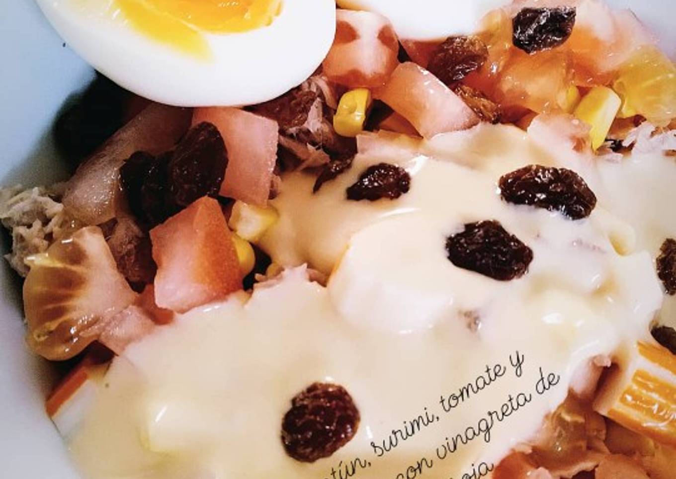 - En un bol colocar primero el arroz y luego añadir todos los ingredientes, cortar el huevo por la mitad, bañar todo con la vinagreta y terminar añadiéndole las pasas.