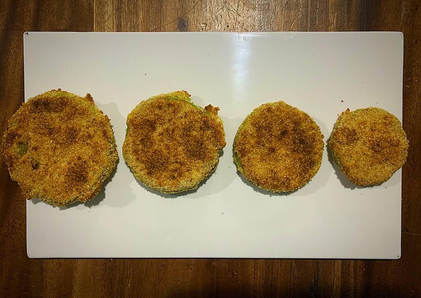 Unas rodajas de calabacín, especiadas y empanadas con una mezcla de pan rallado y parmesano en polvo. En lugar de fritas, al horno. Y fin. Sin más. Una guarnición bien rica. Aquí les dejo el vídeo de la elaboración: https://youtu.be/vcytSxx3-Z0